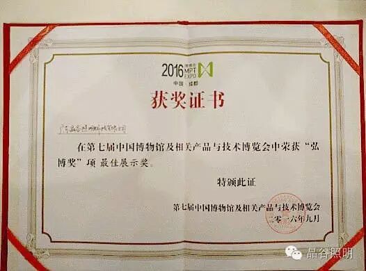 继2014年广东晶谷照明科技有限公司在第六届"博博会"期间获得“弘博奖”项最佳展示奖以来,第七届中国博物馆及相关产品与技术博览会中再获殊荣。
